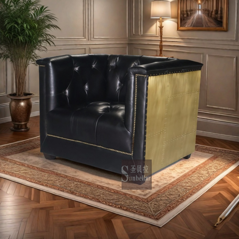 カスタマイズされたアンティークブラック本革チェスターフィールド房付きシングルシートソファ椅子アパートとヴィラのリビングルーム用